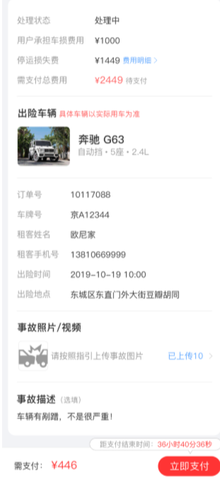 车辆出险后如果产生需要支付的费用,可以在订单中查询费用并确认支付。【我的订单】-【订单详情】-【出险详情】
