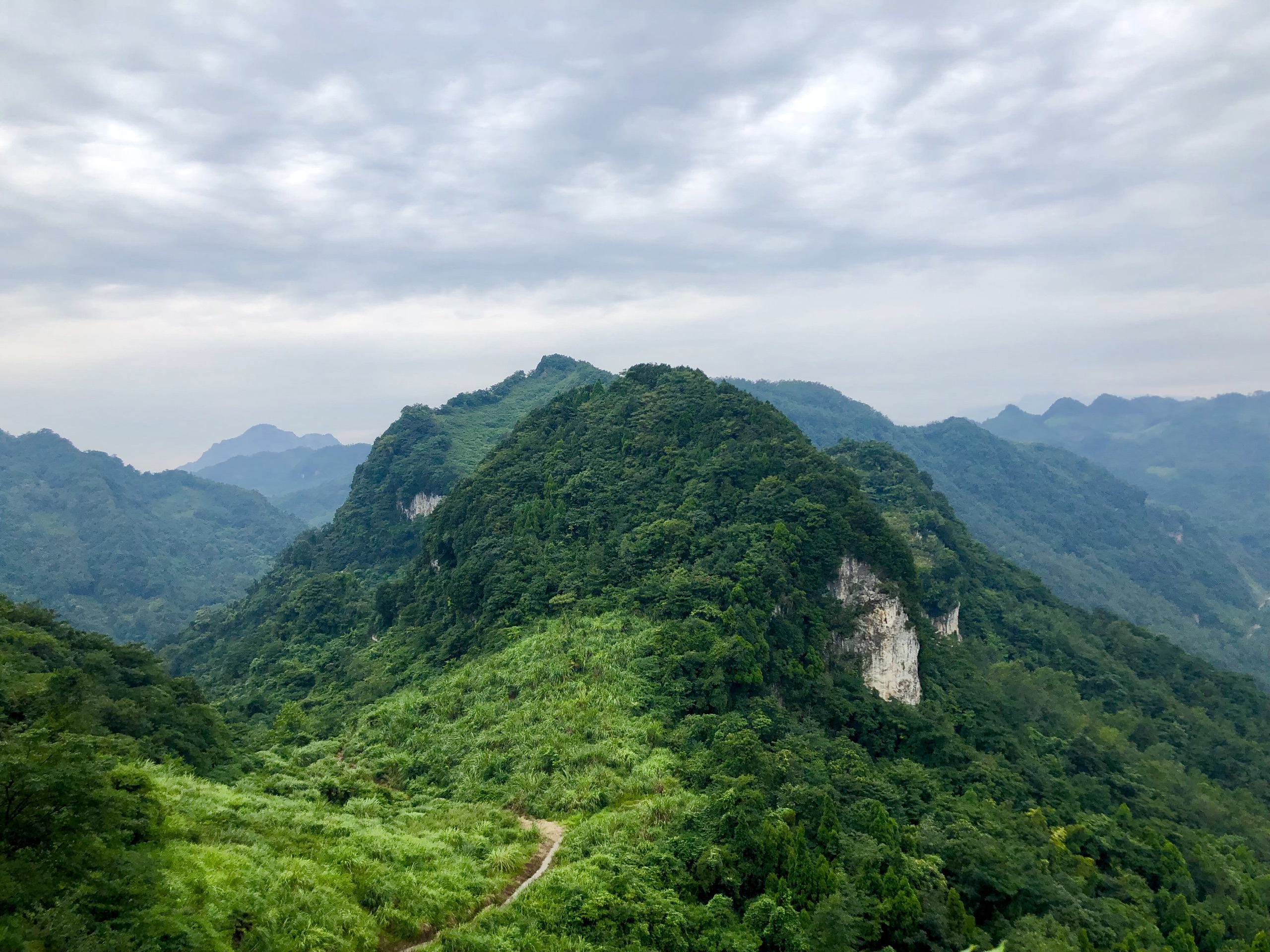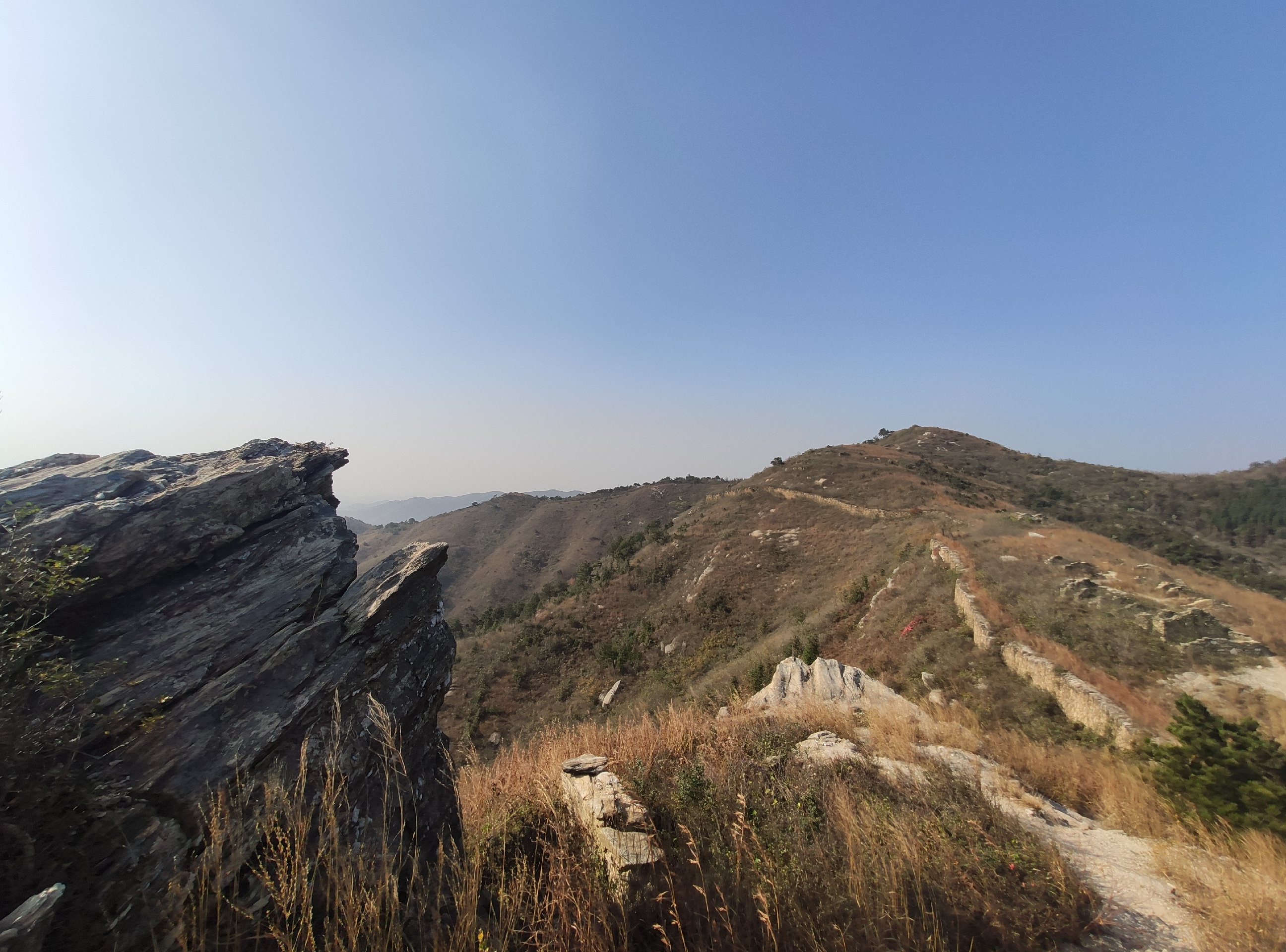 龙王尖山寨是为御匪安民而修建,山墙基本完整,蔚为壮观,号称武汉的长城。寨内昔日有四通八达的大小道路,现已消失在稠密的灌木、藤蔓、野草之中。从武汉出发,两个多小时的车程到达山脚下,抬头,是好久没有看到过的蔚蓝天空,远望是连绵数里起伏不断的草甸,晶莹的湖泊,苍绿的树木淡然地点缀在山谷中,空气清新无比。往上看,山石怪峋的山尖上就是龙王尖古寨,沿着山脊的一条连绵石墙,像长城一样的是寨墙。沿着缓坡上山,放眼望去,漫山都是丝茅草,微风吹过,茅草低伏,发出麦浪一样的声音。