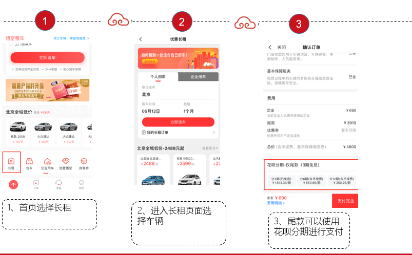 如果是通过app直接预定的长租订单,可以在长租订单提交也查询长租订单的定金金额、本车月租费用及优惠活动。长租尾款可以使用花呗分期进行支付