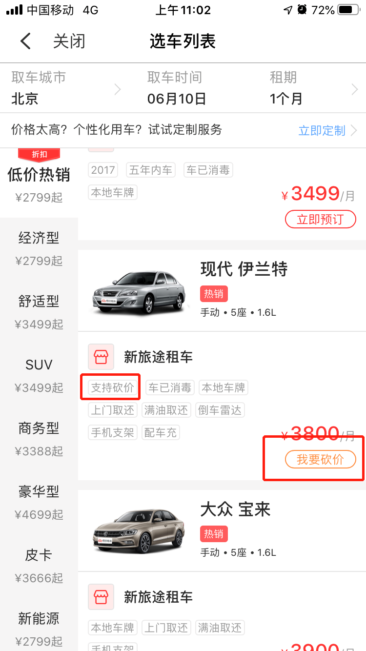 长租部分车辆支持砍价,选择“支持砍价”的车辆,在平台上支付定金后,与商户联系议价。与商户议价成功后,尾款需要通过平台支付