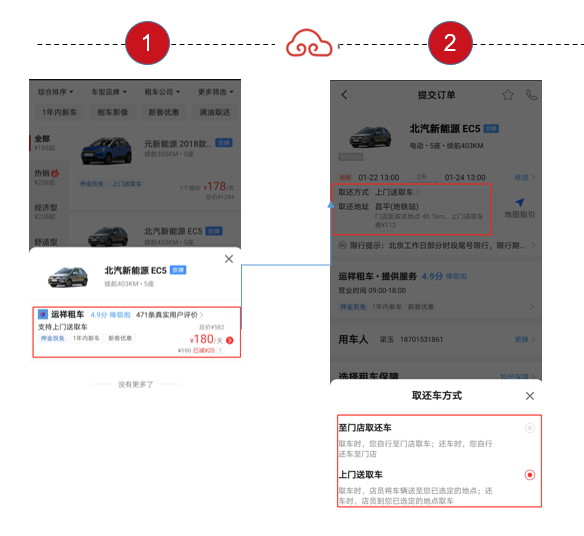 在下单时选择取车地点后,进入选车列表页,在提交订单页可选择上门取送车或者到店取车。上门取送车会提示费用金额,请注意查看